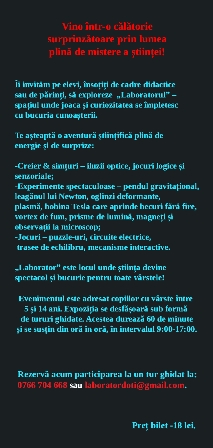 Această ediție aniversară marchează un deceniu de curiozitate, explorare și distracție educativă. Vă așteptăm în „Laborator”, spațiul unde știința prinde viață prin simțuri, unde descoperim legături, găsim răspunsuri și ne lăsăm purtați de curiozitatea noastră și a copiilor.