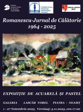 Galeriile de Artă „Lascăr Vorel” din Piatra Neamț invită publicul vizitator în perioada 1 – 27 noiembrie, la expoziția de pictură a artistului Mircea Titus Romanescu, intitulată „Jurnal de călătorie 1964 – 2025”, în cadrul căreia sunt expuse lucrări în acuarelă și pastel.