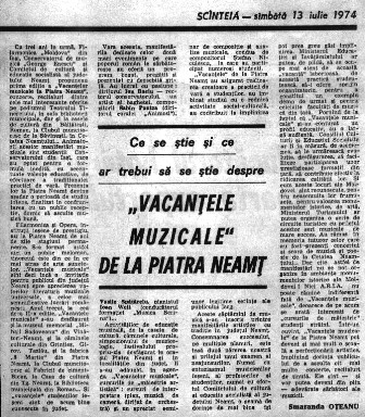 [5] Material initulat Ce se ştie şi ce ar trebui să se ştie despre Vacanţele Muzicale de la Piatra-Neamţ publicat în „Scînteia” din 13 iulie 1974.