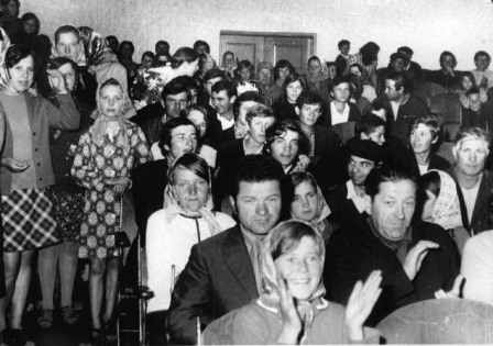 Mai trec zece minute. Nimic. Am intrat în vrie. Ştii cum sunt eu. Venisem cu un cor de peste cincizeci de persoane atâta drum. Omul de acolo era calm. Foarte calm. Pe la fără zece, deodată se deschid uşile de la biserica de peste drum de Cămin şi de acolo ies enoriaşii care fuseseră la slujbă. În cinci minute sala era arhiplină. S-a stat şi în picioare. Uite poza asta îmi dă dreptate.