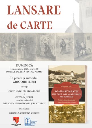 Complexul Muzeal Național Neamț vă invită duminică, 16 noiembrie 2025, de la ora 13.00, la Muzeul de Artă Piatra-Neamț, la un eveniment editorial de excepție care pune în valoare două dintre tezaurele spirituale și culturale ale ținutului Neamț prin lansarea volumului „Agapia și Văratec. Cele două sate mănăstirești ale României”, apărut în toamna acestui an la editura Doxologia, sub semnătura scriitorului Grigore Ilisei.