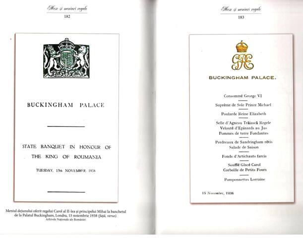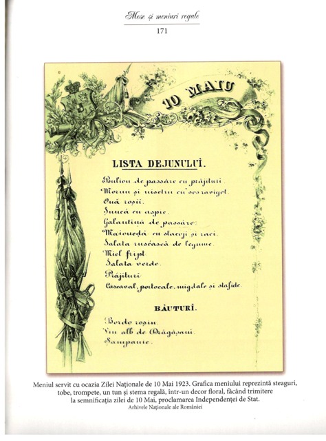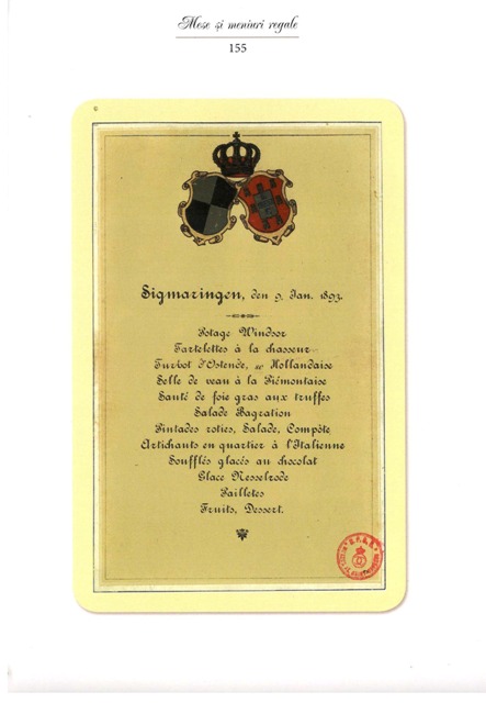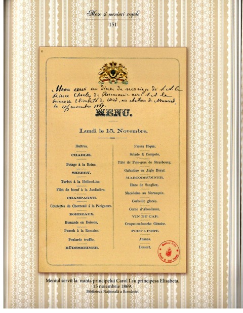 Este meniul, inspirat din bucătăria franceză, de la 1 ianuarie 1881 care a fost servit la masa regală Regelui Carol I și ai Reginei Elisabeta. Fragmentul este desprins din excelenta carte-document a Ștefaniei Dinu (de la Muzeul național Cotroceni) – „Mese și meniuri regale. Eleganță, fast și bun-gust” (Editura Corint Books, București, 2019).
