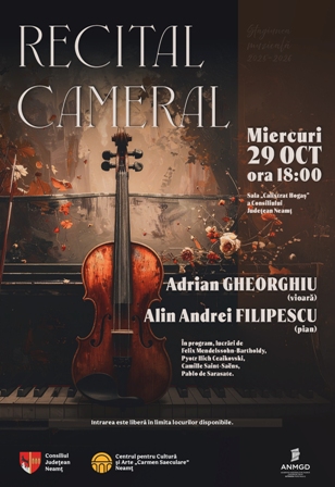 Finalul lunii octombrie aduce, în cadrul Stagiunii muzicale 2025-2026, recitalul cameral susținut de violonistul Adrian Gheorghiu și de pianistul Alin Andrei Filipescu.