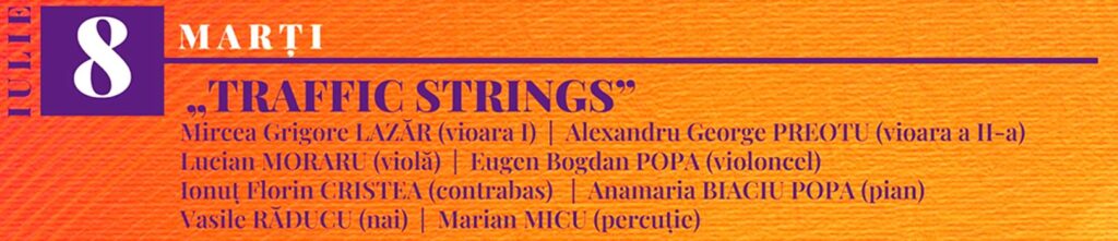 Traffic Strings” propune pentru acest concert un „trafic muzical” de cea mai bună calitate. De la „Vara” din „Antotimpurile” lui Antonio Vivaldi, la armoniile jazz-ului american și pasionatul tango argentinian, programul serii va fi completat cu sunetele mistice ale muzicii lui Erik Satie, cunoscuta „Rapsodie Română”, de George Enescu, împreună cu alte piese dinamice, originale, semnate de Lucian Moraru, fondatorul grupului.